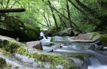 有山有水才相映成趣,尽显风光之妙。从岚河中游向左溯溪而上,水中的石头全是火山岩溶形,个个花纹绮丽,光滑鲜碧,别有趣味。划一叶竹筏,从湖光水色中穿行而过,只见山势耸峙,石壁陡峭,古藤缀拂,远山近水尽收眼底,尽享溪流野趣。水路九曲十八弯,曲曲山回转,颇为著名的是“饮流戏鲵”,水中小鱼悠哉,大鲵暗伏,随便掀翻几块石头,也许就能看到一条,也算得上山溪一绝。