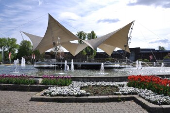 音乐喷泉被郁金香花池围绕着,在每天特定的时间,莱茵公园的亲水平台就会播放音乐,音乐喷泉喷出的水柱会随着音乐的节奏改变形状,忽高忽低,时而高耸入云,时而又聚拢成团,仿佛是会跳舞的喷泉。周围的郁金香在喷泉的滋润下,更加鲜嫩动人。