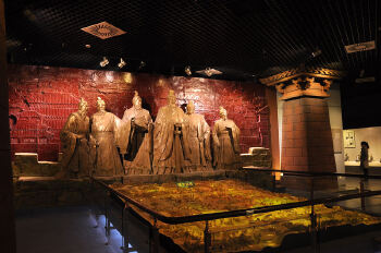 帝国之路内展品有360件,主要的看点是秦公鎛。镈盛行于春秋战国,是单个打击乐器,形体特大的可用以指挥乐队,常用于贵族在祭祀或宴飨等礼仪场合。展厅以周王室的衰败和东迁为背景,描绘了秦帝国的崛起,将蜿蜒曲折的历史脉络展现得淋漓尽致,它借助声、光、电等现代科技手段所全方面呈现的“非子养马”、“武公创县”、“穆公称霸”、“始皇加冕”等历史节点。