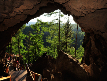 火山口地下森林,神秘莫测,是国家一级自然景源。火山口内壁拥有凸凹不平的断崖,广阔幽静,恢宏壮观。几百年历史的繁茂的针阔叶树和各种花草植被在里面自由生长,著名的“坐井观天”景观就在火山口底,友人仿佛来到了井底,举目抬头仰望,犹如坐井观天,因而得名。地下森林中不乏可爱的小动物,游人拾级而下时,感受到生机盎然的自然活力,林间有鸟儿飞行、蛇儿爬行、兔儿跳行、鼠儿穿行。甚至,马鹿、野猪、黑熊等大动物也会出没,还有世所罕见的国家保护动物青羊。