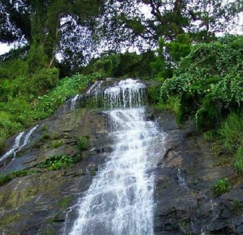 “天女散花”是百花岭内的一个第三级瀑布景观。在两颗参天古树之间有一条巨大的瀑布,贴着悬崖峭壁飞泻直下,打在山崖上,水花飞扬,像天女散花似的,故而得名。在瀑布底下还有一个深不见底的石潭,透过落下来的水帘可以看到石潭上的峭壁上游“白肤潭”三个大字。