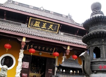 圆通寺内的天王殿与其他地方的天王殿一样,主要供奉着职掌风调雨顺的四大天王塑像,以及护发王韦陀的金像。在天王殿的殿门两则有横坐于金晴兽上的哼哈二将雕塑,在天王殿的门外两侧则有两尊石雕青狮白象。天王殿的建筑彩绘绚烂,斗拱华丽,琉瓦飞甍,气势宏阔,大殿内的佛像,栩栩如生,威严勇猛。