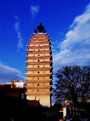 西寺塔又名慧光寺塔,距今已有一千多年的历史,与遥相呼应的东寺塔一起经历了近千年的昆明风雨,是古老文明和文化的见证。西寺塔设塔基三层,塔身为十三级四方形檐式空心砖塔,整座塔高约四十米。塔身挑檐浮雕,外形优美,体现了唐代古塔流畅的建筑特点。塔的顶端有一个铜质塔刹,高约五米,由相轮、伞盖、牟尼珠等组成。