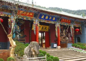 太华寺的天王殿是一座单檐式建筑,大殿高近20米,占地三百六十多平方米。在天王殿的正中有一座站立在莲花神龛上,木雕而成的观音像,双手合十,神态慈祥。在大殿的两旁有粉彩四大天王塑像,神态自然,不怒自威。在大殿内有一尊身披金甲,按剑踞地的护发王韦陀的雕像,神态威严,形象逼真朴实。