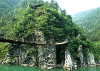 泸定铁索桥位于四川省西部,两岸有桥头古堡,全为木质结构,在国内独有。该桥因在1935年红军长征途中的知名历史事件“飞夺泸定桥”而闻名。桥全长一百多米,宽三米,共分为桥身、桥台、桥亭三部分。全桥都是由铁环环环相扣制作的铁链构成,只有底链上铺了木板。泸定桥以其特别的风景和历史价值一直广为国内外游客关注。