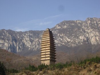 嵩山大法王寺位于河南省郑州市登封市,四面环山,绿树翠盖,环境清幽,空气清新。站在寺外远眺可看见两山对峙,从这里可以俯视二熊诸山,层峦叠嶂,小溪潺潺,风景十分美丽动人。方形砖塔就坐落在法王寺后山坡上,高约四十米,共十五级,外观白灰色,塔内有汉白玉佛像一尊。