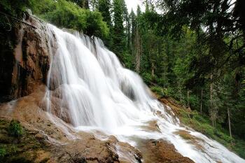扎嘎大瀑布位于黄龙风景区的牟尼景区三联村后的寺沟内,海拔3270米,瀑高93.7米,瀑面宽35~40米,是由很多台阶式的瀑布组成的叠瀑布,并且层叠的方式也大抵不同,蔚为壮观,据地质学家鉴定,扎嘎瀑布既是一个固体瀑布也是一个液体瀑布,固体瀑布指的是整个瀑面河床为钙华体,钙华尤如彩色液体飞流直下,金光闪闪,很是好看,这个瀑布也是全国目前发现的较大的钙华体瀑布。
