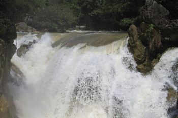 银链坠潭瀑布位于天星桥景区水上石林的左上方,在黄果树众多的瀑布群中,它并不是较高的也不是较阔的,但它却是众多瀑布中颇为风情万种的,让人看见就难以忘记,瀑布高10多米,底部是槽状的溶潭,上方呈漏斗形状,谭面上隆起了很多的石包,这些石包像一张张的荷叶长在谭面上,而正是因为这些“荷叶”才让潭中的水犹如银链一样倾泻而下,煞是好看。