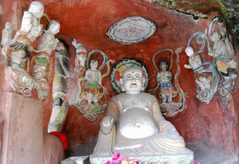 金像寺位于四川省乐山市夹江县千佛山下,是千佛岩文物风景旅游区又一名胜之处。一到金像寺大门,即可看到寇遐撰书的门联。名家墨韵,美景美文,相得益彰。金像寺,只是在山门之后,依山建有两座相连的半边庙宇,为摩崖造像遮风蔽雨。四根檐柱上分别是赵之谦给金像寺的题诗。金像寺的摩崖造像,有石窟五龛,总计造像60多尊。造像人物有弥勒佛、文殊、罗汉、力士等。寺内有一碑记载:“千佛山金像禅苑乃我朝成化创建,……”成化十年,一位和尚在此处舍身焚献,修建寺庙,镌刻佛像。金像寺摩崖造像镌刻于明代成化年间,具有典型的明代石刻艺术的特点。