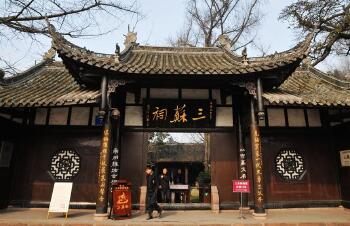 三苏祠位于四川省眉山市城西,是苏洵、苏轼、苏辙的故居,明代洪武元年为纪念“三苏”而改宅为祠,清康熙四年在原址模拟重建。现成为古典园林。庭院红墙环抱,古木扶疏,形成三分水二分竹的岛居特色。楼台亭榭;匾额对联。祠内有苏洵、苏轼、苏辙及苏家六公子等十余人的塑像;有木假山堂等苏家遗迹;珍藏和陈列着有关三苏的文物,是盛名的人文景观。三苏祠一直是广大民众拜祭的场所,是一座富有四川特色的古典式的园林建筑,周围,绿水萦绕,曲径亭榭,小桥频架,堂馆亭榭错落有致,有“三分水,二分竹”的“岛居”之称。从古到今,许多文人墨客来此吟诗作对,留下隽永的对联。