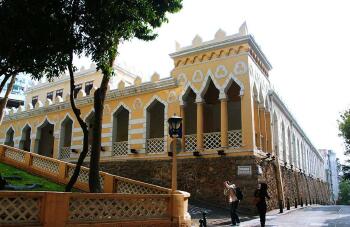 "港务局大楼,于1874年建成。1905年,改为澳门港务局的办公地点。今日的港务局大楼的办公室已搬至海港楼,它的重要作用逐渐淡出。大楼建筑位于妈阁山边,是一座受阿拉伯色彩特色的砖石建筑,它建在一由花岗石围筑而成的平台上。除了近妈阁山一侧外,建筑物三周均有回廊回绕,这种廊式是建筑对本地气候的反映。
