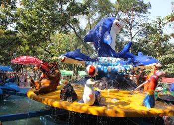 “激战鲨鱼岛”是一款深得年轻人喜爱的旋转类游乐设备的游戏,设备上的承载人数为24人。当游戏开始时,游客们乘坐着会旋转的飞船,通过装在船上的水枪或激光枪来射击安置在鲨鱼岛上的各种造型,当游客击中目标后,感应器就会做出感应,击中的目标便会做出喷水、举手等各种动作,位于鲨鱼到正中的鲨鱼先生如果被射中,就会向游客喷出水柱来攻击游客,被水柱打中的游客只能像个落汤鸡似的爬下飞船,如果不想被水柱打中,就要求游客更全身心的投入躲闪鲨鱼先生的攻击。