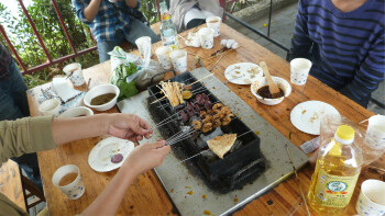杨柳青庄园烧烤有200元、300元和600元的亭子可以选择,建议10个人以内就选择200元的就好,当然人多的话也是有大亭子的。其中200元包括辣椒面、孜然、盐等调料(如果觉得调料会不够用,可以自己带去一点以防万一),一袋碳,一碗油,以及扇子、烤铁架、炉钩子、凳子、桌子等烧烤工具。其他的包括食物、竹签、纸巾等则需要自己另外购买,肉一般是3元/串,一次性竹签则是1毛/根,当然了这些也可以自己事先准备好(小编强烈建议大家事先准备好食物等材料,因为里面的一般都比市场上的贵好多),庄园里有水可以清洗蔬菜和水果。这里的烧烤一般在下午两点左右就结束了,因此要合理分配时间。