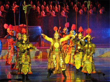 “凤鸣九天”剧院位于大唐芙蓉园南门北面,正居园区的主轴线,北对主体景观紫云楼。剧院结合南高北低有4米高差的地形特点设置观众大厅,大幅降低了建筑高度,分解了建筑体量。剧院建筑约面积5830平方米,可容纳606名观众。剧院房顶四只金色凤凰展翅起舞,引颈高歌,展现了剧院特定的名称与功能。剧院金碧辉煌,设施一流,是一个蕴涵盛唐风韵的皇家内苑式剧院,是全园盛唐主题演出的核心表演区。剧院的主打节目,是大型诗乐舞剧《梦回大唐》,舞蹈起源于民间祭祀。至盛唐时,政通人和,文化艺术空前繁荣,音乐、舞蹈日臻完善,唐歌舞是盛唐时期文化鼎盛的象征。唐歌舞气势磅礴,集诗、歌、赋予吹奏弹唱;融钟、鼓、琴、瑟于轻歌曼舞。乐曲高亢,动作流畅,服饰华丽多彩,堪称历代歌舞之最。这里要特别介绍,在园内可容纳六百多名观众的凤鸣九天剧院内上演的大型梦幻《梦回大唐》,这是一台集盛唐风情、歌舞精粹、狂欢多彩于一体的综合性乐舞表演,是一场充满梦幻与诗意的大唐盛典,带给观众的是动感与大气、华贵和美艳的无与伦比的艺术享受。全剧演出时间为70分钟,共分六幕。用音乐与舞蹈演绎着千古流传的经典爱情。分别由“游园惊梦”和“梦幻霓裳、梦浴华清、梦邀秦王、梦萦西域、梦游曲江、梦回大唐”六个乐章组成。