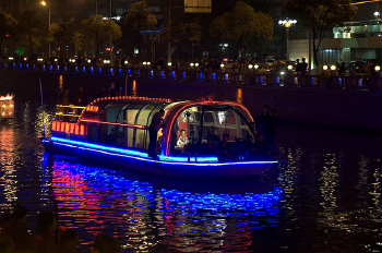晚上坐着游船看着美丽的夜景,让人流连忘返,可以看到江边的风景外,可以近距离的看音乐喷泉。