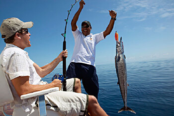 在马尔代夫,人气比较旺的一项活动是:海上垂钓。在海上钓鱼,能钓到很多色彩斑斓的热带鱼,运气好的话,你还能钓到大型的鱼,当然,垂钓成果丰硕与否,得看你的钓鱼技术,也许你也有一无所获的霉运。钓上来的鱼可以制作成菜品享用,海鲜本来就鲜美,再加上是自己亲手劳动的,吃起来是不是别有一番滋味呢?