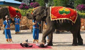 云南民族村的群象表演,群象全天都在景区,有时候表演,有时候会让观众跟象群合影,不严格按照景区节目单的时间表进行。大象表演的场地周围有人推着车卖大象吃的香蕉,10 块钱一包,还有卖甘蔗的,可以购买喂大象。