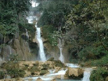 考安西瀑布高约两百多米,呈正三角形,从山上飞跃而下时非常壮丽,它附近的植被也很美丽。站在瀑布前,清凉的水珠扑面而来,仿佛心灵也受到了荡涤。激流泛过层层叠叠的石灰岩,飞落直下地面墨绿色的深潭,甚是壮观。瀑布雨季水量特别大,靠近瀑布的观景台已成了花洒下的浴盆,老挝的炎热在这里也消淡了很多。