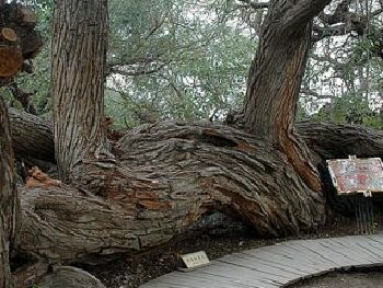 位于,海拔l700米,占地600余亩的园林,叫天山神木园,也被称为“戈壁明珠”,是历史上伊斯兰教集会和朝拜的圣地。库尔米什阿塔木麻扎,实际上是分布在高出地面几十米的土丘上的一处墓葬群。园中的树木种类很多,有杨树、榆树、柳树、白蜡树、还有核桃、杏树等。那些苍劲的古树,有的曲折盘旋,贴地而伸;有的匍匐在地,犹如龙蛇之状;有的躯干壮硕稳固,枝条随风起舞;有的树头与根部相连,分不清哪是根,哪是枝,形态各异。