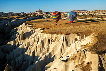 卡帕多奇亚是世界上玩热气球很受欢迎的地方之一,人们来到这里不得不做的一件事情就是乘坐热气球。卡帕多奇亚由于火山喷发后形成的熔岩,在自然风蚀后形成的千奇百怪的地形,所以乘坐热气球可以将卡帕多奇亚的全景尽收眼底,有山谷的衍生,山脉的褶皱,弯曲的河流,散落的集镇,一切尽在鸟瞰中。