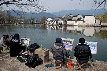 宏村背倚黄山余脉羊栈岭、雷岗山等,地势较高,经常云蒸霞蔚,有时如浓墨重彩,有时似泼墨写意,真好似一幅徐徐展开的山水长卷,因此被誉为“中国画里的乡村”。倚赖着天然美景,来宏村写生的学生或者绘画爱好者不少,成为了一道另类的风景线。