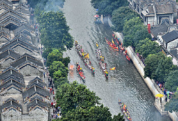 每年端午节的龙舟竞渡,是杭州西溪蒋村的传统习俗。自唐代始,盛于南宋,沿至明清尤甚。乾隆南巡时,曾至蒋村观龙舟,亲封为 "河渚龙舟竞渡"。至今这一习俗仍为四乡农民的盛会。每到端午节上午,村民从四面八方的水路,划着龙舟汇集到水网密布的蒋村。龙舟前饰龙首,后装龙尾,船舷两旁排列健壮的操桨手,船尾有持长桨的舵手,船上彩旗招展,也有全用彩色幔帐的,船里坐着敲锣打鼓的。各船锣鼓喧天,你追我赶。河两岸的观赏者已成人墙,欢声雷动。蒋村的龙舟竞渡重在参与、表演,不争名次。来回竞渡中花样百出,翻船、落水者时时有之,又迅速把翻船反过来或从水中爬上船,千姿百态。这时船上操桨者与岸上观赏者都其乐融融,欢声笑语溢满水面田间。