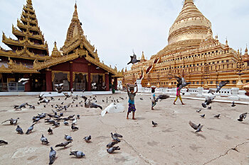 蒲甘道路两边可见到大、小不一的佛塔矗立。真可谓:“出门见佛塔,步步遇菩萨”。在现存的100多座著名的佛塔中,有的红砖旧瓦、古旧沧桑,有的金光闪闪、雍荣华贵,有的洁白素雅、朴素大方。那些历史时期建造的各色佛塔、佛寺的建筑成为缅甸古老建筑艺术的缩影,体现了缅甸劳动人民的智慧和创造力,成为缅甸珍贵的历史文化遗产。游览这座城市最好的方式就是租辆马车,走走停停,随心所欲,车夫还是你最好的导游。虽然所到之处全是佛塔与佛庙,但是却一点都不会乏味,两千余座佛塔与佛庙没有一座雷同,圆顶的、尖顶的、没顶的都有。走进寺里,又是另一种感觉,大小的砖石或横或竖或平地而起,堆砌成宏伟壮观又庄严的佛像,到访过的游人无不留下深刻的印象。