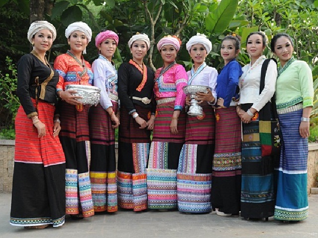 西双版纳是傣族的主要居住区,傣族生活的地方,都是热带、亚热带地区,气候温热,山林茂密、物产丰富。傣族服饰也就充分体现了这些地理特点,淡雅美观,既讲究实用,又有很强的装饰意味,颇能体现出热爱生活,崇尚中和之美的民族个性和民间习俗。各地男子的服饰差别不大,一般常穿无领对襟或大襟小袖短衫,下着长管裤,以白布、水红布或蓝布包头。傣族妇女的服饰,因地区而异。西双版纳的傣族妇女上着各色紧身内衣,外罩紧无领窄袖短衫,下穿彩色统裙,长及脚面,并用精美的银质腰带束裙;德宏一带的傣族妇女,一部分也穿大统裙短上衣,色彩艳丽,一部分(如潞西、盈江等地)则穿白色或其它浅色的大襟短衫,下着长裤,束一绣花围腰,婚后改穿对襟短衫和统裙;新平、元江一带的“花腰傣”,上穿开襟短衫,着黑裙,裙上以彩色布条和银泡装饰,缀成各式图案,光彩耀目。