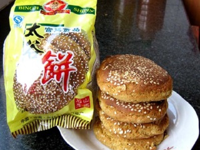 太谷饼,是一种面制炉烤的实心饼,产于晋中平原的太谷县。直径12厘米,厚约2厘米,周心薄厚均匀,表面呈现茶黄色,粘有脱皮的芝麻。食用时有酥而不硬,软而不皮,香甜不腻,利口不粘牙的特点。还具有存放四不变的特色,即存时间一月以上色、味、质、软硬程度不变。这是一种历史悠久的炉烤的实心面饼,可以当茶点或旅行时食用。