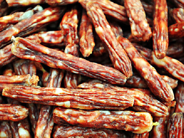 犬肉,俗叫“狗肉”,早先肉户常把煮熟的肉块装入用白蜡树条编制的圆形高筐内挑着赶集出售,故又称“高筐肉”