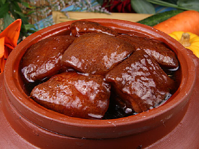 天津坛子肉因使用陶瓷坛烧而得名.猪肉于沸水中浸烫,切块取特制小坛铺板子骨,放肉块调料肉皮密封坛口,文火焖熟,入碗凝固定型.呈枣红色,晶莹透明,油润烂滑,香浓味美,肥而不腻.食前加热,滋味不变,亦可配白菜、面筋、土豆等.为冬季时令菜.已有200余年的历史
