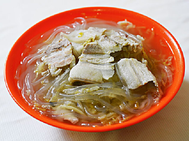 哈尔滨酸菜粉是哈尔滨的一个地方特色小吃.它的做法是:主料:酸菜、猪瘦肉半斤,粉丝一小把;辅料:葱姜蒜少许,花椒粉、酱油、味素若干.制作:豆油少许,烧开后放入瘦肉丝炒,到水份煸干,有香味,半熟,放花椒粉,葱姜蒜,炒到微黄;放酱油,味素,放酸菜,将作料炒均匀,添少许水,放入烫软的粉丝;开锅炖5分钟左右,把汤靠干,出勺,即可食用了