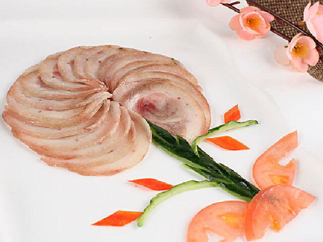 捆香蹄,产自江苏省新沂市的传统特产.一种捆香蹄肉类制品.它是以剔除中间主骨,保留蹄皮及趾骨的新鲜猪蹄为主原料,在其内包裹有腌制的猪精肉及熟皮丝相混合的馅料,经卤煮、杀菌得成品.本发明外形美观,保留了猪蹄的形状、味美、香气浓,保质期长,是一种即开即食的肉制品.其特征是以剔除主骨保留蹄皮及趾骨的新鲜猪蹄为主料,在其内充填经香辛料卤制的猪精肉及皮丝制成的馅料
