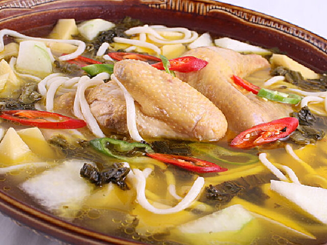岜夯鸡是文山州广南县壮族独有的一道传统美味菜肴,为云南一绝.“岜夯”为壮语,意为酸汤,是用红青菜或野菜制作的一种酸菜汤.烹制岜夯鸡时,首先将洗净的鸡肉切为小块,用佐料拌匀浸透;再把准备好多种佐料入锅,倒入酸汤;沸腾后放入青菜、猪油,煮一至三分钟后放入鸡块.汤沸后即可食用.也可放入粉丝、木耳、海带等一同煮吃.岜夯鸡以香甜、鲜美和奇特的酸味为特色,油而不腻,开胃,易消化