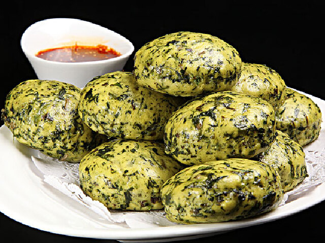 艾菜馍是马山壮家的一种独具风味的食品.这是壮族人在欢度花朝节(农历二月初二)时,普遍制作的野菜馍.因为这个节日要求人们戒荤食素,祭祀花婆(百花仙子)也要用素品祭祀.所以人们都要做艾菜馍.其做法是:到田野上采摘回艾菜,将其洗净捣碎,挤出菜汁,将糯米浸泡,待糯米瀑胀后,滤干、碾碎,加入适量黄糖,将艾菜与米粉搓捏成球状的馍馍,可水煮、蒸熟或煎熟.艾菜馍清凉香甜,味道鲜美,有消除腻意,增进食欲的作用