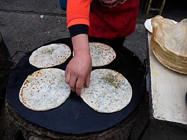 “菜煎饼”是山东淄博一方人的主食,有着悠久的历史.主要工序是拦馅和烧烙,将豆腐、粉条、韭菜或葱,用油或大油炒熟,然后把煎饼揭开,均匀摊馅并折成长方形,再在锅内加油将两面烙成金黄色即有内软外脆、菜香扑鼻之特色