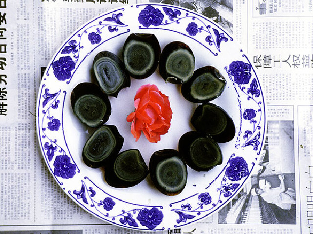 松花皮蛋,它是用新鲜鸭蛋加工腌制而成的一种生吃食品,因为它经过腌制加工使蛋清和蛋黄凝固静皮,剥开不粘蛋壳,且富有弹性,所以简称为“皮蛋”,成熟的松花皮蛋横切或竖切,切开后呈五颜六色,层次清晰,所以松花皮蛋也称为“彩蛋”.在加工过程中,由于各种原料的作用,使原来的生鸭蛋发生了色彩上的变化,因而它又称“变蛋”