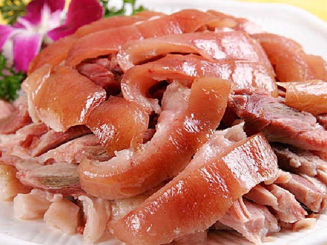 水晶肴蹄是镇江名菜,已有三百多年历史,镇江“宴春酒楼”的水晶肴蹄,更是名不虚传.水晶肴蹄是在古菜“烹猪”及“水晶冷淘”的基础上发展起来的,精肉略呈淡红,虽凉而酥烂易化;胶东透明光滑,故曰“水晶”,柔韧不拗口,不肥不腻.此菜上桌时,可根据不同肉质切出不同名目的肴肉,如“眼镜肴”,“玉带钩肴”,“添灯棒肴”,“三角棱肴”等.食之爽口开胃,色雅味佳,配以姜丝,香醋,更有一番风味
