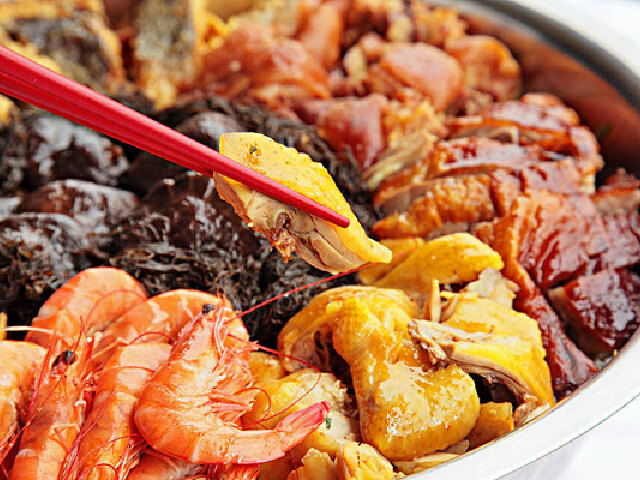 大盆菜历史悠久.相传南宋末年,宋帝为逃离元兵追赶,落难到新会,正当随从四处张罗食物之际,当时的村民得悉皇帝驾临,为表心意,纷纷将家中较为珍贵的食物贡献出来,仓促间以木盆权充器皿,盛载佳肴.加上村民又挖空心思,将杂项菜式一层一层排在下面,鸡、鹅、猪肉等好菜则放置在木盆顶层,不致失礼.宋帝吃盆菜的故事,现在已沿袭成风俗,历数百年而不改.