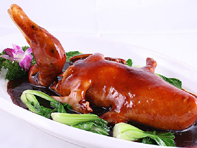 是上海城隍庙老板店的特色菜肴.这家店创设于光绪二年(1876),以善制上海菜著称.“八宝鸭”早在清代就有,在1887年重修出版的《沪游杂记?酒馆》记载,“八宝鸭”一菜,当时是上海苏帮菜馆的名菜,它取用肉鸭拆出骨架,盛入馅心蒸制.30年代中期,老板店根据一位顾客的建议,前往大鸿运酒家购置了“八宝鸭”回来研究、仿制,在操作上与苏帮略有不同,并重用火功烹制.他们取用光鸭不出骨,配以栗子、肫肝、火腿等八种辅料,上笼蒸酥.成菜后香味浓郁,滋味鲜美,很受顾客欢迎,不久就闻名于市.数十年来,一直深受中外顾客喜爱.特点:用肥鸭加八种配料蒸制而成.成菜色泽红润,形状完整,鸭肉酥烂,腴香浓溢,汁浓味鲜。工艺:将肥壮嫩鸭宰杀,治净,劈开背脊,剪去鸭脚,入沸水锅焯水后捞出,洗净、沥干,在鸭身上抹上酱油.将笋丁、肉丁、火腿丁、栗子丁、鸡肫丁、冬菇丁、莲子、虾米、糯米饭放入碗内,加绍酒、酱油、白糖、味精,拌和成馅.放入鸭肚内,背朝上放入盛器,上笼蒸三四小时,至鸭肉酥烂时取出,翻扣在大盘中.炒锅烧热,下猪油,将虾仁滑熟取出,锅内留油少许,放笋片、冬菇片,加酱油少许、蒸鸭原汁适量,烧沸后放虾仁和熟青豆,下湿淀粉少许勾芡,淋上猪油,出锅烧在鸭身上即成