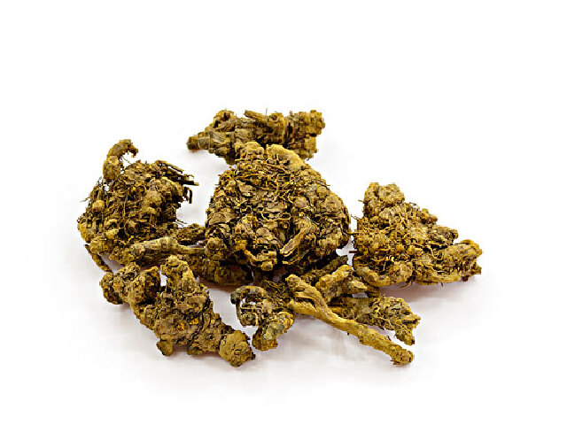 毛莨科多年生草本植物云南黄连的干燥根茎.明代兰茂《滇南本草》载:"滇连,一名云连……功效胜川黄连百倍"."云连"因此得名.历来畅销内地和香港等地区.原植物根茎黄色,较少分枝;叶基生;株高15-30厘米;多歧聚伞花序;长骨突荚果,种子长圆形;花果期2-6月.商品呈弯曲的长条形,具"过桥杆",断面金黄色,味极苦.能泻火燥湿、解毒杀虫,治疗各种热毒及烧烫伤.含多种生物碱,其含量和抗菌消炎药效比川黄莲好.与四川的"雅连"并列为黄连中的珍品而享誉国内外,是历代医家非常喜爱的云南名药.主产于福贡、贡山及腾冲.腾冲云黄连又称为"光明连".云南1955年收购22吨,1988年出口5吨,1996年产量约为4-6吨.云黄连市价比川黄连高2-3倍,用根茎繁殖,为家种或半家种,成本高,费工时,单产低(1亩仅产0.5-2千克)