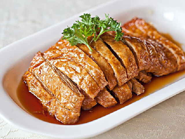 盘鸭的特点:色泽黄亮、味鲜香浓、菜形美观