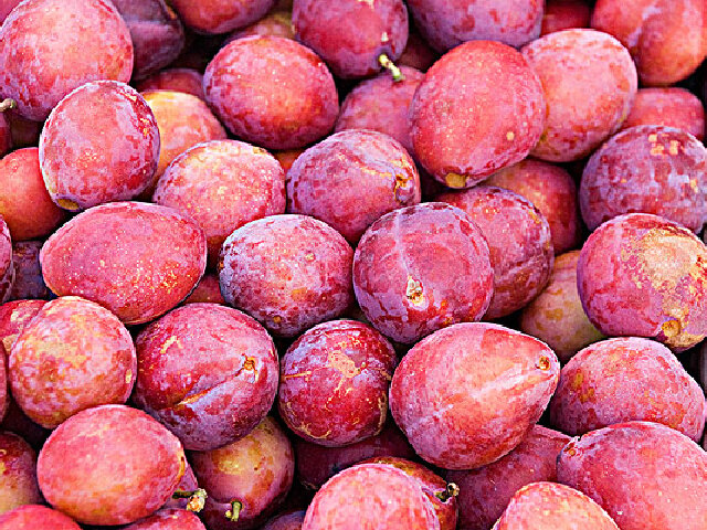 产品特征:形圆而稍扁,皮薄呈绿色,果肉近核部分紫红,核小,肉多,水足,味甜而略带酸,清香爽口,营养丰富.平均单个重60克左右,青果时外有一层白色粉状物,成熟后消失.