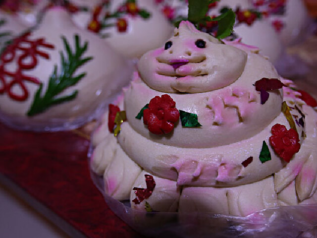 咸阳花馍:用面团捏塑人物、花鸟、鱼虫,蒸熟后调涂色素.春节用状如猪、羊的花馍做献贡、祭祀神灵.元宵节用状似十二生肖的花馍,互赠亲友,俗称“牛犊”,入夜,点燃面灯上贡.端午节做艾叶馍.乞巧节做面制的笔墨纸砚,刀尺剪针等.祝寿做寿桃,丧葬做献糕.庙会做面花馍献祭.孩子弥月、过岁做花饼.妇女手法细腻精巧,配以鲜艳花色,千姿百态,生活气息浓郁