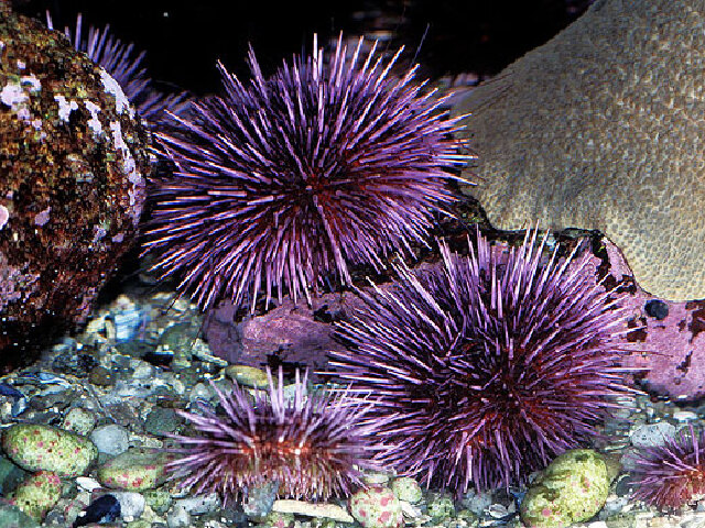 紫海胆,俗称刺锅子.大连是中国的紫海胆主产地,产量占全国同类产量的95%以上.其体呈球形,直径一般6-8厘米,高3-5厘米.大棘坚硬端尖,棘黑紫色,生活于低潮区岩石、海藻丛生或石缝中.紫海胆的生殖腺营养价值极为丰富,不仅具有较高的经济价值,而且还具有药用价值,是预防心血管病等疾病的有效药物.从中可提取“波乃利宁”具有抑制癌细胞生长的作用