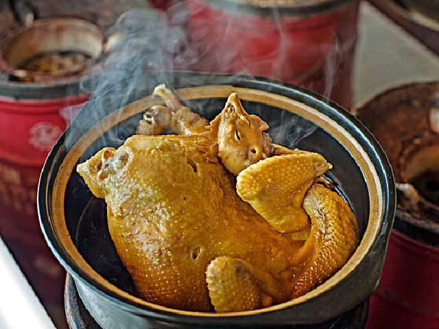 隔水蒸鸡,同样是茂名的一道名菜,化州人早期引以为荣的葱油鸡、白切鸡在盐焗鸡的冲击下,失去了一定的魅力.于是饭店经营者们想起当地民间有隔水蒸鸡的制法,制作其实很简单,挖空鸡内脏后,塞进香菇虾米之类,整鸡装在盘里,然后把它放进装有一定量开水的锅里,用火加热慢蒸,利用沸水蒸汽把鸡蒸熟,这样的鸡既香滑鲜美又性情温和,让吃怕了煎炸食物的人们胃口大开