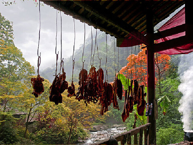 正月里到萍乡人家里做客,餐桌上均有几样色香味俱佳的腊制肉食品待客,初次品尝的外地人都赞不绝口.熏腊肉是萍乡一种特有的饮食风俗.熏制的方法是,先将肉用盐渍十天左右,若是腿肉,要用刀划几条口子,将盐渍透.尔后将肉悬挂在离火盆高一米处,用木柴、锯末、谷壳等熏烤.熏烤时火候不可太大,宜文火慢熏,半月后见肉泛金黄色即可,再用清水洗去烟垢晾干,食用时可蒸可炒.除熏制腊猪肉外,还可熏制鸡、鸭