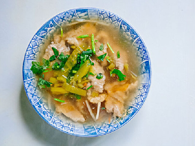 ⑷炒锅上为,加鸡汤500克,放入葱段、姜块及肉片,加入盐、料酒,开锅后用小火烧制,待肉酥烂时,加入香菜末、葱丝、姜丝、胡椒面、味精、醋淋少许香油,即可盛装在汤碗中