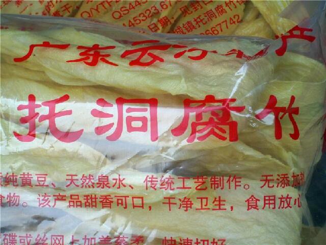 “托洞腐竹”产于素有石城之称的云浮市云安县石城镇托洞。托洞腐竹之所以久负盛名,皆因其原材料和传统的制作与其他腐竹制作不一样。制作时采用当地大云雾山下土生土长的黄豆或小青豆(黄豆的一种)作为主要原料,并且采集来自大云雾山山泉的水制作,整个制作流程都不添加任何材料。所有变化过程都是基于物理反应所至。