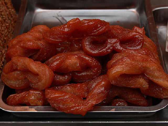 蜜麻花又称糖耳朵,因为它成形后形状似人的耳朵而得名.前人有诗曰:“耳朵竟堪作食耶?常偕伴侣蜜麻花,劳声借问谁家好,遥指前边某二巴”.蜜麻花宜在秋、冬、春季食.因为夏季炎热,糖稀容易脱落,不易吃.